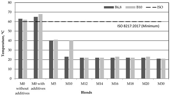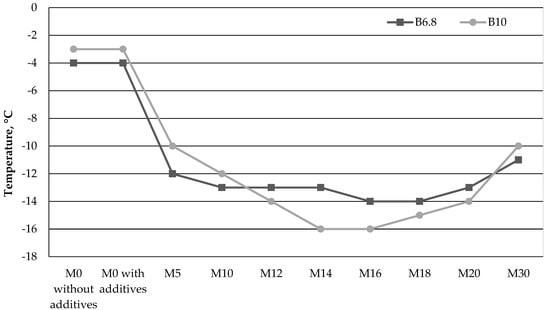 Results of the test of the cloud point of methanol–biodiesel–diesel mixtures: The highest cloud point was found for B6.8M0, which was 2.5 times higher than for the B6.8M30 mixture, where the methanol content increased from 0 to 30% (volume basis). The addition of dodecanol and 2-ethylhexyl nitrate additives to the mixtures showed no change in the cloud point temperature of the mixtures and had only minimal effects on the variation of this parameter.