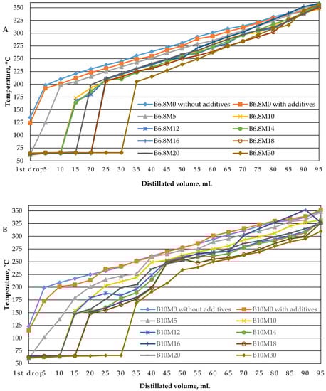 Results of testing the distillation of methanol–biodiesel–diesel mixtures: (A)—biodiesel content in blends: 6.8% (volume basis); (B)—biodiesel content in blends: 10% (volume basis).