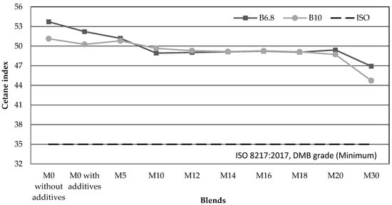 The highest cetane indexes were found in non-methanol blends with 6.8% (volume basis) biodiesel (cetane index: 54) and 10% (volume basis) biodiesel (cetane index: 51) (Figure 7). With a methanol content of the blend of 30% (volume basis), the cetane index of B6.8 and B10 blends fell by 13% to 47 and 45, respectively.