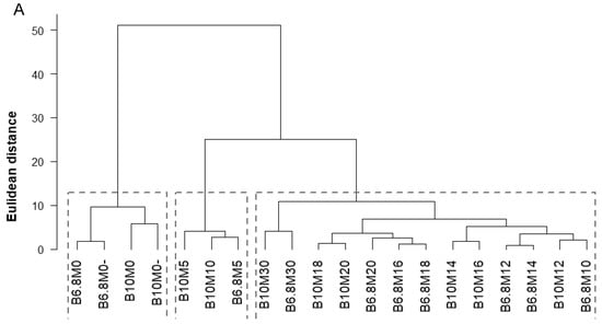 Results of the multivariate analysis: In the cluster analysis, three significant (F = 332.05; df = 1; p = 0.001) groups were determined (Figure 8), the first one mainly consisting of mixtures without methanol. In the second cluster, the mixtures with methanol concentrations of 5% (B6.8M5 and B10M5) and a mixture with 10% (B10M10) dominated, and the third cluster consisted of all remaining mixtures.