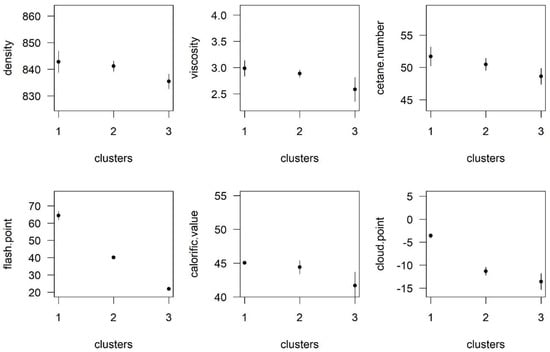 Among the physical properties of the mixtures, flash point was the most discriminated variable (Figure 9), with the mean values differed significantly (p < 0.001) between the specific clusters (i.e., the highest mean value was in the first cluster and the lowest mean value was in the third). Similarly, the means of cloud point significantly (p < 0.05) differed between the clusters. The mean of density in the second cluster was significantly (p < 0.05) higher than the mean in the third cluster, whereas the mean in the first cluster did not significantly differ from both clusters. The mean of cetane number in the first cluster was significantly (p < 0.05) higher than the mean in the third cluster, whereas the mean in the second cluster did not significantly differ from both clusters. The means of viscosity and calorific value did not significantly differ between the first and the second clusters, but they were significantly (p < 0.05) higher than in the third cluster.