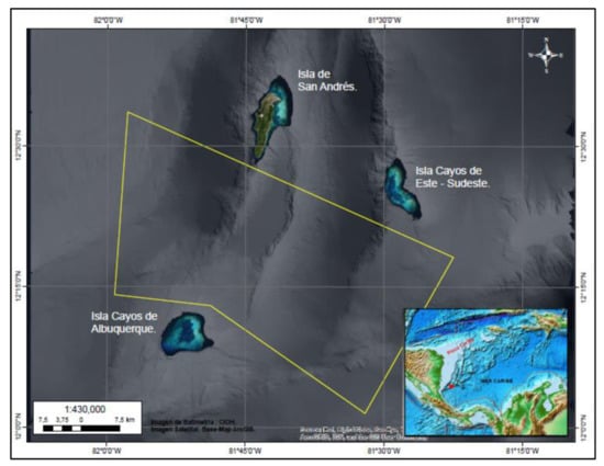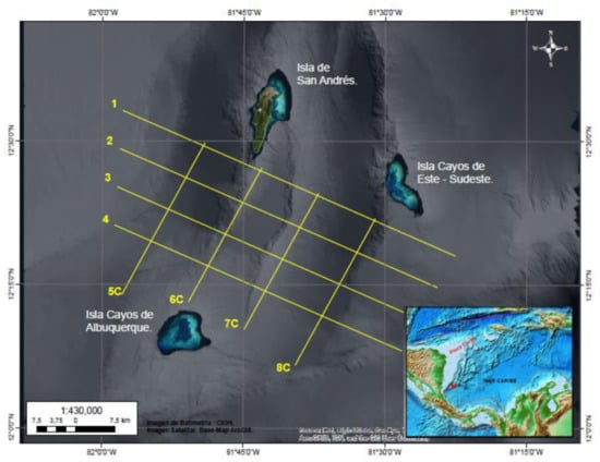 The study area is located in the Colombian Caribbean Sea and more specifically to the south of the archipelago of San Andrés, Providencia and Santa Catalina (SAPSC). The geophysical survey was carried out in the area located between San Andrés Island, Cayos de Albuquerque Island and Cayos de Este-Sudeste Island, within the polygon marked in yellow, as can be seen in Figure 1. The study area covers an area of approximately 2040 km2.