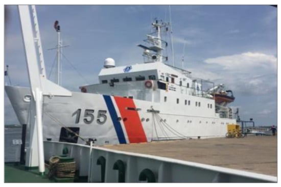 The acquisition is made with the help of the ship’s personnel, taking into account certain guidelines, such as a maximum velocity of 5 knots, and a separation from the sensor of at least three times the length of the vessel, which in this case was 150 m. It is important that the “fish” is towed from the stern, as indicated in Figure 9.