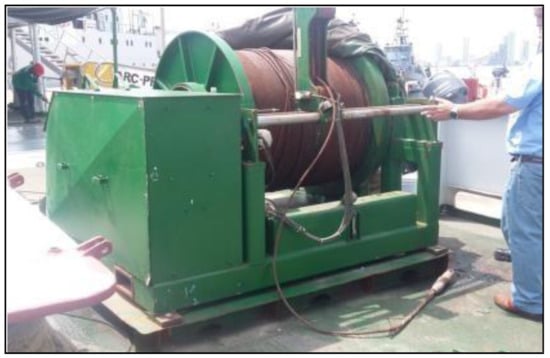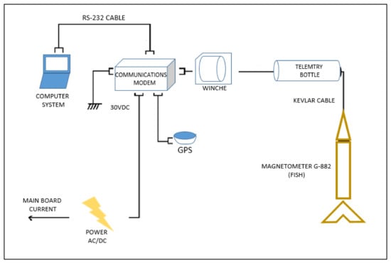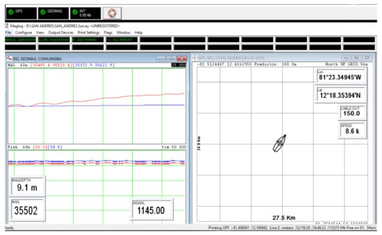 The assembly used in the vessels is shown in Figure 7. The magnetic data are communicated from the sensor and submerged in the water, passing through the winch, the on-board cable, and finally, arriving at a “junction box” where the magnetic data are related to those of the positioning obtained by the Global Navigation Satellite System [,]. From there, they are transmitted to and visualized in the computer by means of MagLog software [], as shown in Figure 8.