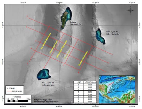 Starting the planning activity, it is essential to have high-resolution bathymetric data, in order to support the identification of the geological structure that is required to be recorded with magnetometry []. As the objective of the project was to determine the magnetic anomalies, generated by the volcanic bodies and geological structures (faults) located to the south of the SAPSC, in the vicinity of San Andrés Island, Cayos de Alburquerque Island and Cayos de Este- Sudeste Island (Figure 1). The survey lines were carried out, taking into account the geoforms displayed in the bathymetry. For this reason, the lines are established perpendicular to faults or other structures, in regular meshes, where it is ensured that the separation between lines is equal to the estimated minimum distance between the sensor and the magnetic object or target. This is why it is recommended to take into account the depths at which the survey will be carried out [].