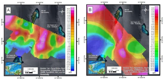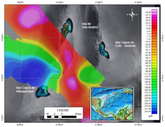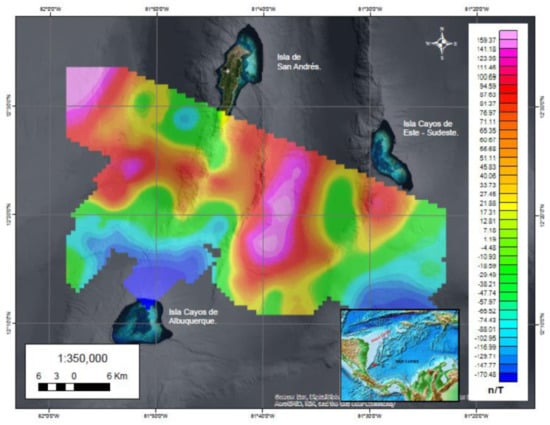 The significant magnetic anomalies, which can be seen in Figure 11, marked in fuchsia/magenta, correspond to a magnetic high. In Figure 10, it can be seen that this anomaly corresponds to the geomorphology of the Nutibara depression, and that it could be generated by some type of mineral deposition that can be found, associated with ferrous materials, or also with volcanic material with a high iron content compared to its geological environment. On the other hand, magnetic lows are observed north of the Cayos de Alburquerque Island, which would seem to be a contradiction, since its morphology is typical of a seamount, and, therefore, its magnetic response should be high [,,].