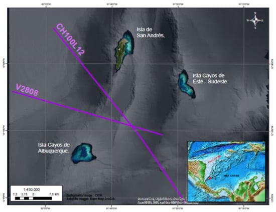 The geophysical study comprises the data collected between 20 June and 1 July 2018, in an area south of San Andrés Island, comprising four lines perpendicular to the general direction of geological structures, with a maximum length of 70.67 km, and four lines parallel to these formations, with a maximum length of 31 km. A grid-shaped geometric arrangement was preserved to provide good resolution for a regional geological study. The general direction of geological structures and geoforms has a northeast direction [,].