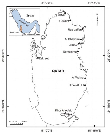 Avicennia marina (Forssk.) Vierh., the only mangrove species occurring in Qatar, is found in the tidal habitat between mean sea level and high tide water level []. The aboveground biomass in this natural mangrove is higher near the sea than on upper levels near the land [], so sampling at different tidal levels is required to encompass this range of growth. Field studies were conducted between November 2010 and November 2012 at 10 sites, two natural mangrove stands at Al Khor (25°41′50.53″ N, 51°33′08.18″ E) and Al Dhakhira (25°44′53.17″ N, 51°32′11.03″ E), and eight sites with planted mangroves (Zekreet (25°29′13.53″ N, 50°50′07.62″ E), Al Mafyar (26°08′33.75″ N, 51°16′35.57″ E), Fuwairit (26°02′00.32″ N, 51°22′04.37″ E), Ras Laffan (25°56′13.67″ N, 51°31′50.03″ E), Semaisma (25°34′37.90″ N, 51°29′17.28″ E), Al Wakra (25°10′47.43″ N, 51°37′00.56″ E), Umm Al Hul (25°04′52.54″ N, 51°37′03.98″ E), and Khor Al Adaid (24°38′41.36″ N, 51°19′49.24߱ E) along the eastern, northern, and western coasts of Qatar (Figure 1).