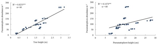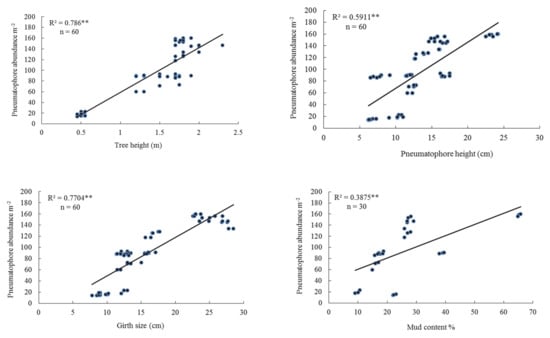 It has been suggested that pneumatophore abundance can be used as an index of the anaerobic status of the soil in which mangroves are growing []. As hypothesized, pneumatophore abundance increased with the percentage of mud (silt + clay; Table 2) and decreased with oxygen content. Similar to other studies [], we found a strong positive correlation between pneumatophore abundance and mud content in sediment at the middle (R2 = 0. 7962) and lower tidal levels (R2 = 0.7411) (Figure 3, Figure 4 and Figure 5), but a weak correlation (R2 = 0.3755) at the upper tidal levels (Figure 2). The negative correlation with oxygen level generally being weaker (Figure S3). The presence of mud in sediment decreases the porosity, and hence the amount of oxygen the sediment can contain []. Sites with a high mud content thus become progressively anaerobic, and in response, the mangrove trees at such sites develop increasing pneumatophore abundance []. Pneumatophore abundance is reported to be lower in mangroves on sand-dominated sediments [,,]. Besides, sites with a higher mud content in the sediment likely offer more favorable conditions for plant growth, as mud particles adsorb more nutrients than coarser sandy particles [].