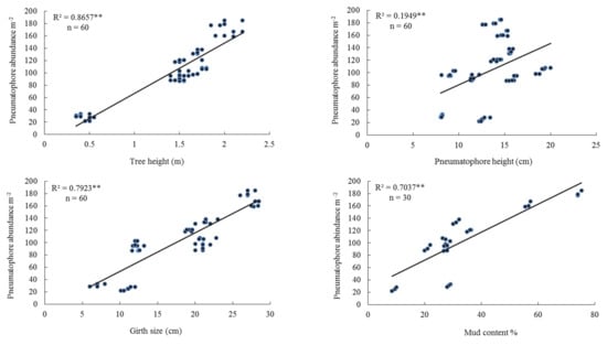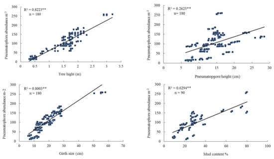 Linear regression pneumatophore abundance, tree height, pneumatophore height, girth size, and mud content in the middle tidal level. Level of significance ** p < 0.001.