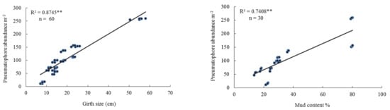The aim of the present study was to evaluate the relationship between mangrove tree size, sediment mud content, oxygen, and crab burrows in sediment, and pneumatophore abundance in Avicennia marina (Forssk.). As sediments with higher mud content have more anaerobic conditions due to lower permeability [], we hypothesized that there would be a positive relationship between pneumatophore abundance and sediment mud content, and a negative relationship between pneumatophore abundance and sediment oxygen level and number of crab burrows.