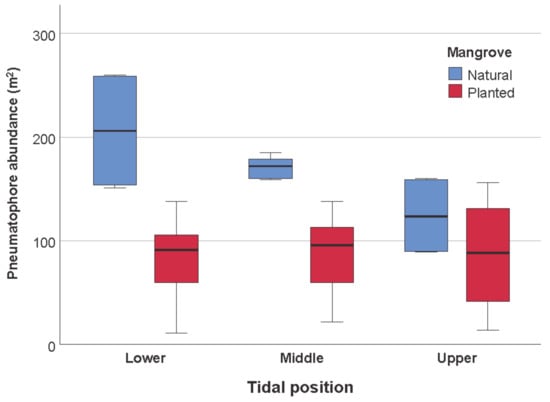The overall abundance of pneumatophores in natural and planted mangroves at all three tidal levels at all sites investigated varied between 14 and 516 per m2, with an average abundance of 171.8 ± 20.39 per m2 (Table 2). In previous studies, pneumatophore abundance in A. marina has been found to range between 56 and 1168 per m2 in Pakistan [], between 4 and 1950 per m2 in Kenya (Dahdouh-Guebas et al., 2004), and between 80 and 180 per m2 in Mozambique [,]. In addition, pneumatophore abundance in A. marina has been shown to vary with microtopography in the intertidal zone, with depressions on the landward side having higher densities of pneumatophores than depressions closer to the sea [].