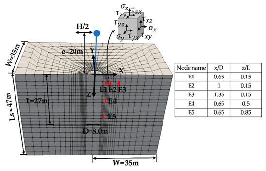 The stress conditions induced by the cyclic lateral loading were inspected for five soil elements E1 to E5, as shown in Figure 1. Their horizontal distance and depth normalised by the pile diameter and length, respectively with respect to the origin of a cartesian reference system located at the centre of the pile and at the ground level, are also given in Figure 1. The adopted convention for the normal and shear stress components for each soil element follows the adopted cartesian reference system as also reported in Figure 1. It should be noted that in this simplified case, the soil was considered to be drained, with a dry unit weight γdry = 15.6 kN/m3. Therefore, the stresses were all effective in this paper.