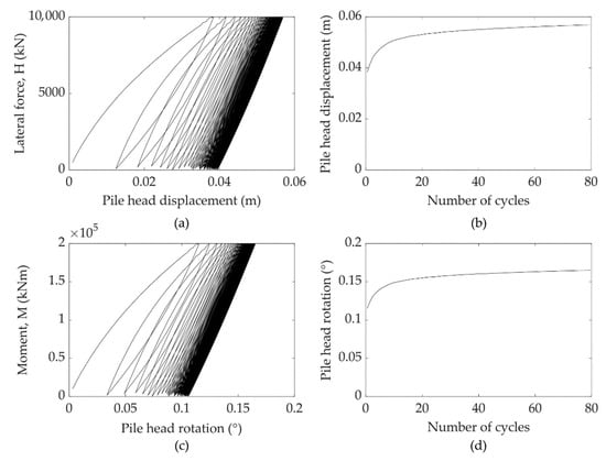 The overall response of the monopile foundation is reported in Figure 2. The lateral force versus pile head displacement and the applied moment versus pile head rotation are reported in Figure 2a,c, respectively. The pile head displacements and rotation versus number of applied cycles are shown in Figure 2b,d, respectively. These plots show the capability of the FE model to predict the trends of progressive accumulation of displacement and rotation as observed in model pile tests [22,23]. Larger accumulations of rotation and displacements were observed at the early cyclic stages, followed by a progressive stiffening of the pile repose and a decrease in the rate of displacement and rotation accumulation. This response could be predicted owing to the capabilities of the employed constitutive model, which has proved to satisfactorily capture the ratcheting behaviour and the progressive soil stiffening under cyclic loading [12,24,25].