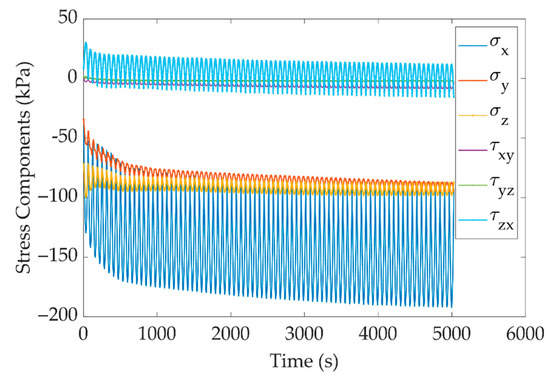The application of the cyclic lateral load may cause, for a given soil element, the variation of all six stress components. However, the inspection of the stress components variation for the investigated elements revealed that the two components of the shear stress (τxy and τyz) outside the x-z plane remained constant with a value close to zero for the applied cyclic loading, as shown in Figure 3 for the element E1. This observation is quite advantageous in the context of soil element laboratory testing in which the simultaneous control of the six stress components is unachievable by the current laboratory element testing capabilities. The hollow-cylinder torsional apparatus (HCTA) is the only experimental equipment permitting the simultaneous control of up to four stress components (but only one shear stress component). Therefore, considering the observed stress variation in Figure 3 and the practical limitation of testing practice, the analysis of the stress components for the selected soil elements is limited to those components in the x-z plane which is parallel to the direction of lateral loading (see Figure 4).