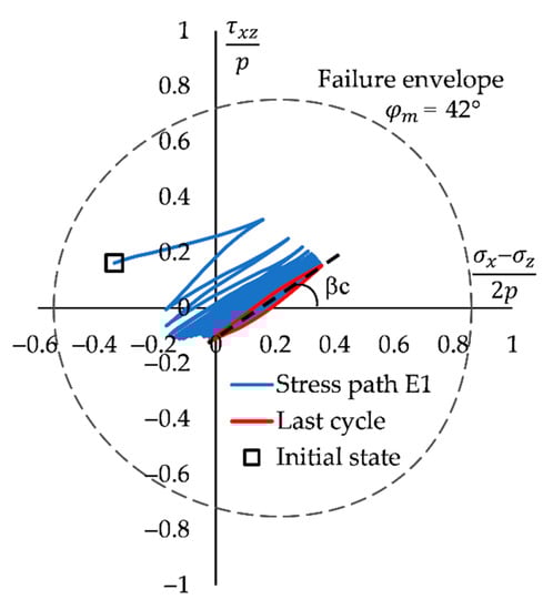 The stress path from the FE analysis for the investigated soil element E1 is reported in Figure 5 in the τxz/p versus (σx − σz)/2/p stress plane, where p is the mean isotropic stress, a conventional representation plane for hollow-cylinder torsional testing results [26]. For reference, Figure 5 also reports the Matsuoka–Nakai [27] peak failure envelope for the sand material for an assumed friction angle φ of 42°, which was the maximum mobilised friction angle observed in the FE simulations. The applicability of the Matsuoka–Nakai criterion for the material tested and the loading conditions was demonstrated by Mandolini et al. [28]. The initial stress for the element E1 lies on the negative side of the (σx–σz)/2/p as a result of the vertical stress being higher than the horizontal. Application of the cyclic lateral pile loading induces an inclined stress path, which progressively moves towards the positive side of the (σx − σz)/2/p as the cyclic loading proceeds but it also seems to evolute with a decreasing rate. The stress path corresponding to the last loading cycle is also singled out in Figure 5 and it is characterised by an inclination βc on the assumed stress plane. Such a stress path produces a rotation of principal stress axes (ασ in Figure 4). It should be noted that, since a stress path imposed in a triaxial test would be represented by a horizontal stress path lying on the (σx − σz)/2/p, such conditions would not be simulated by triaxial tests.