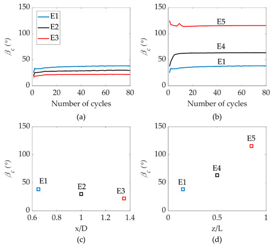The inclination βc versus number of cycles for varying distances and depths are illustrated in Figure 7a,b, respectively. The βc for all elements approached constant state as the cyclic loading proceeds. The relationship between the inclination βc of the final stress cycles and the location of the inspected soil element is reported in Figure 7c for varying distances and in Figure 7d for varying depths. The depth of the soil element had a more pronounced effect on stress path if compared with the distance from the pile.