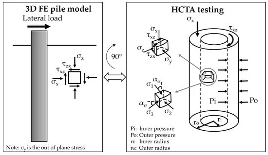 In order to facilitate the comparison between the stress paths determined in FE and those applied in the HCTA, the stress notation presented in Figure 8 was adopted in these experiments. A 90° rotation between the reference stress system of the FE and the HCTA was applied as shown in Figure 8: the stress σx aligned with the lateral pile load (horizontal) in FE became the axial stress in a HCTA sample, as shown in Figure 8, while the vertical stress σz in the FE model became the circumferential stress in the HCTA sample.