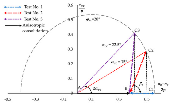 Test 1 considered only the application of normal stress cycles Δσx = 35 kPa (Point C1 in Figure 9). Conversely, Test 2 simulated the additional effect of torsional stress cycles: the sample was subjected to the same cyclic normal stress amplitude Δσx = 21 kPa and an additional cyclic shear stress amplitude Δτxz = 20.5 kPa (Point C2 in Figure 9), both simultaneously applied. This imposed a cyclic rotation of principal stress axes, ασc, varying between 0° and 15°, and it corresponded to an inclination of the stress path βc = 63°, which is consistent with the cyclic loading directions observed by the FE analysis. The maximum rotation of principal stress axes imposed during this cyclic test is indicated by ασc in Figure 9. It should be noted that the rotation of principal stress direction ασc is half of the angle formed by the stress path with the horizontal axes.