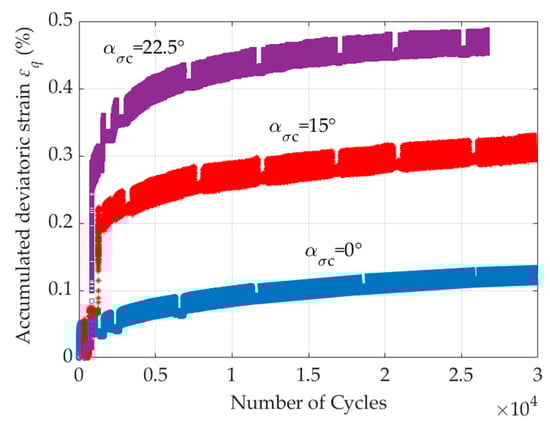 The observed deviatoric stress (q) versus deviatoric strain (εq) for all the three tests is reported in Figure 10. The three tests follow the same stress path from point A to B, which represents the transition from the initial isotropic stress to the precyclic anisotropic stress condition. From point B, the stress paths applied in the three tests become different. The application of inclined stress paths in the τxz/p versus (σx − σz)/2/p results in a slightly larger maximum applied deviatoric stress despite the same maximum mobilised friction angle. It is also clear that the application of stress paths involving reorientation of the principal stress axes induce a larger development of plastic strain, both in the first and the following cycles. As expected, the plastic deformations accumulated in the first cycle are much larger than those in the consecutive cycles. As the cyclic loading progresses, a gradual sand stiffening occurs in combination with reduced plastic dissipation. The soil response seems to progressively transition from ratcheting to shakedown. Figure 11 reports the trend of accumulated deviatoric strain versus number of cycles for the three tests. While the mobilised friction angles φm in all three tests were similar, a remarkable change in the amount of accumulated deviatoric strain can be observed among the tests.