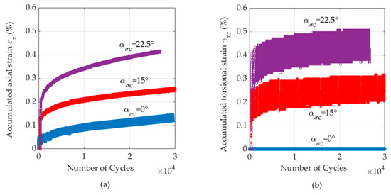 Figure 13 reports the trends of accumulated torsional shear versus axial strains, showing that the application of inclined stress paths in the τxz/p versus (σx − σz)/2/p resulted in inclined trends of accumulation in a similar strain plane. The strain paths for individual cycles demonstrate that the application of torsional stress resulted in negligible elastic (recoverable) variations of axial strains but important development of plastic deformation.