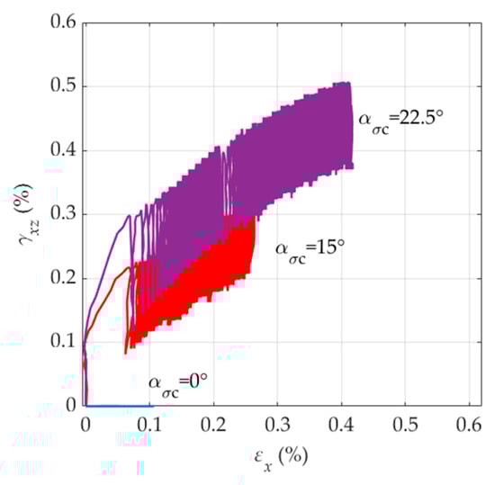 Figure 12a shows that the amount of permanent axial deformations increases with the applied rotation of principal stress axes despite the lower amplitude of the axial stress loop. The amplitude of recoverable variation of εx within a single cycle appears to diminish with the decrease of the applied cyclic axial stress amplitude. However, the progressive accumulation of permanent axial deformations had an opposite trend, and it increased with higher cyclic torsional stress amplitudes. This suggests that there was an important coupling between cyclic torsional stresses and accumulated axial strains which should be considered when modelling pile–soil interaction problems, as it may affect the evolution of the strain field around the pile and, in turn, its displacement and rotation. Conversely, the axial stress does not seem to have influenced the accumulation of torsional strains (Figure 12b). This coupling is expected to be related to the shear stress–dilatancy relationship, which links shearing to plastic volumetric (and thus axial) deformation and should be properly captured during the application of long-term cyclic loading.