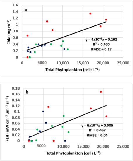Linear regression modeling of (a) monthly averaged MODIS satellite estimates of chlorophyll a or (b) monthly averaged MODIS satellite estimates of FLH versus ship-based measurements of total phytoplankton counts at Jeddah (blue dots), Al Shoaibah (green dots) and Al Qunfudhuh (red dots).
