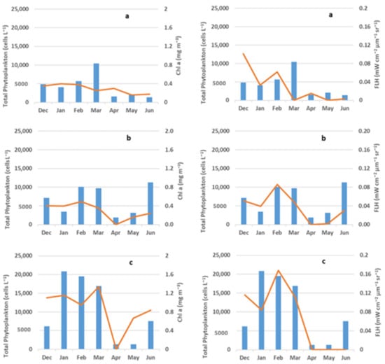Ship-based surveys of phytoplankton in the Red Sea in this study were compared with MODIS Aqua satellite-based estimates of Chl a and FLH for the Jeddah, Al Shoaibah and Al Qunfudhuh sites (Figure 2). A good relationship was observed between ship-based total phytoplankton counts and monthly averaged MODIS Chl a or FLH estimates (Figure 2a,b). Chlorophyll a values were an accurate predictor of total phytoplankton (R2 = 0.49, RMSE = 0.27 mg m−3), as were FLH values (R2 = 0.47, RMSE = 0.04 mW m−2 µm−1 sr−1)). Temporal trends in Chl a and FLH generally followed temporal trends in total phytoplankton, except in March at Jeddah (10,467 cells L−1) and in June at Al Shoaibah (11,300 cells L−1).
