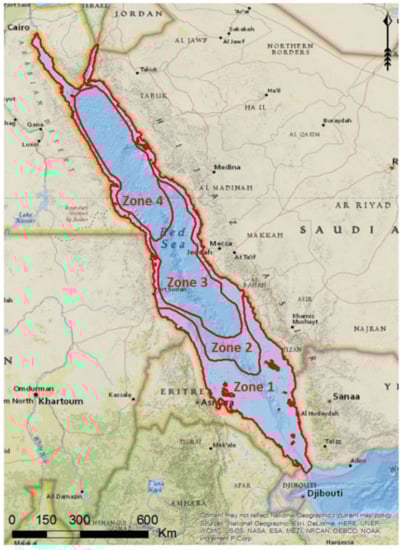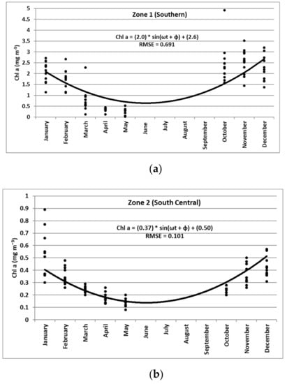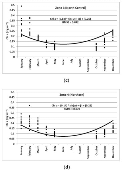 Red Sea Phytoplankton Biomass Provinces have been delineated along lines of equal latitude by Raitsos et al. [] based on Chl a concentrations measured with MODIS satellite imagery. This study refines these Provinces for the entire Red Sea based on long-term (Oct–May 2005–2016) spatial data trends in MODIS Chl a values. Data from June–September were not included, because phytoplankton densities are typically low during those months. Our goal in this refinement was to better reflect spatial and temporal patterns in phytoplankton densities that are not aligned with the generalized latitudinal boundaries proposed by Raitsos et al. []. In particular, this refinement is intended to better represent spatial and temporal patterns in phytoplankton biomass near Saudi Arabian coastal areas where major desalination plants are located. Monthly mean MODIS values of Chl a from 2005–2016 were calculated, and refined curvilinear boundaries based on these data were hand-digitized to delineate the four Red Sea Phytoplankton Biomass Zones. Chlorophyll a data within these boundaries were fit with a sinusoidal function [] Asin (ωt + φ) + m, where A is the fitted amplitude of Chl a (mg m−3), ω is frequency (2π/24), t is month (1 = January 12 = December), φ is phase shift (π) and m is the average fitted maximum value for Chl a (mg m−3). Accuracy of this model was determined by computing a root mean square error (RMSE). A one-way analysis of variance (ANOVA) test for mean differences was calculated on the data within each digitized boundary after checking the three assumptions for use of ANOVA.