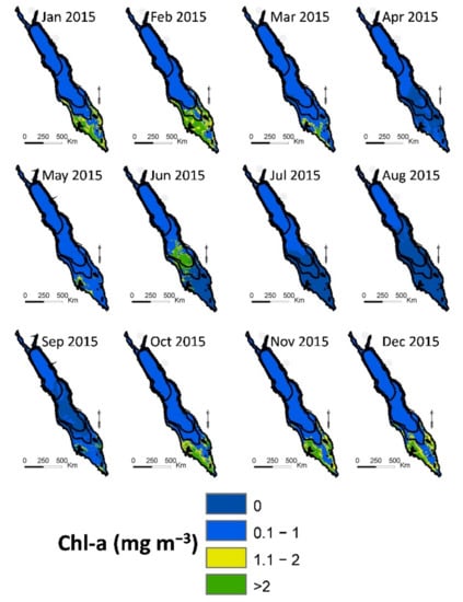 MODIS-based monthly average Red Sea chlorophyll a levels (see color scale in legend) during 2015 with Phytoplankton Biomass Zone boundaries (black lines) originally shown in Figure 5.