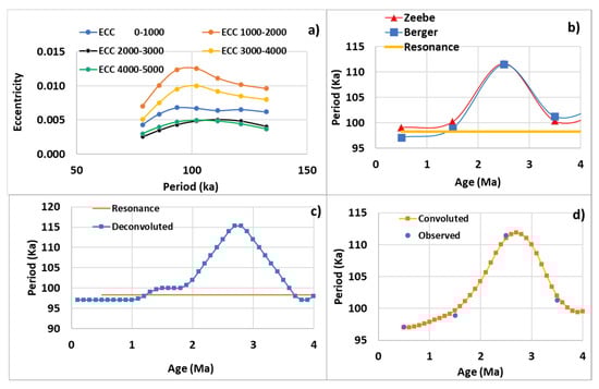 Variations in the period of eccentricity in the vicinity of 100 Ka calculated from Berger and Loutre []—(a) Fourier transform of eccentricity variations over 1 Ma time intervals—(b) Periods vs. time observed at the maximums of the Fourier transforms in a). The same values calculated from Zeebe and Lourens [] are also represented—(c) Deconvoluted curve of the period vs. time represented in (b–d) Comparison of the moving average over 1 Ma of the deconvoluted curve in (c) and the period vs. time in (b).