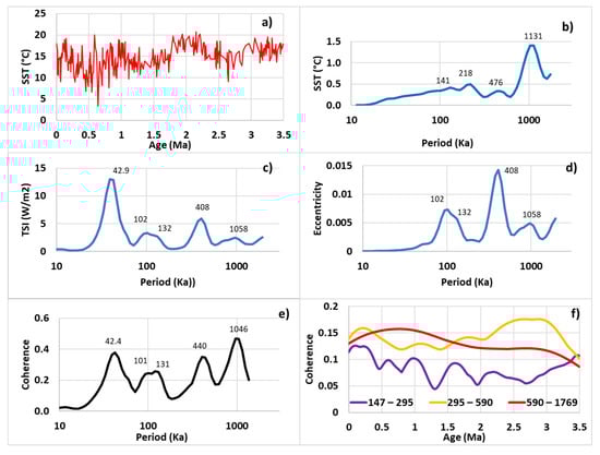Data used in the present study—(a) Alkenone concentration vs. time at DSDP Site 593 used as a proxy of Sea Surface Temperatures (SST)—(b) Fourier transform (FT) of SST vs. time. Maximums of the peaks are in Ka—(c) FT of Total Solar Irradiance (TSI)—(d) FT of eccentricity variations—(e) Coherence of TSI and SST vs. period—(f) Coherence of TSI and SST vs. time.