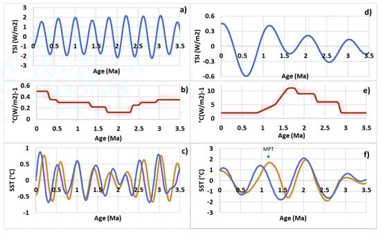 Whether it is Mid-Pleistocene or Pliocene-Pleistocene transition, two subharmonic modes are forced simultaneously. They are and whose natural periods are 49.2 and 98.3 Ka during the first transition, and and whose natural periods are 0.39 and 1.18 Ma during the second. The natural period of the highest mode tunes transiently, but optimally, to the forcing period when both become very close (Figure 3c and Figure 7c). Here again it must be noted that the results obtained do not depend on the orbital variations calculated by the two authors [,] as shown in Figure 7b. Then, the two subharmonic modes swap the dominant mode, as attested by the nearly symmetrical opposite variation in the forcing efficiencies (Figure 5b,e). The forcing efficiency of the higher mode exceeds 10 °C (W/m2)−1 between 2.4 and 1.6 Ma BP when the tuning is optimal whereas that of the lower mode drops to 0.12 °C (W/m2)−1. The change in the dominant period occurred approximately 2.2 Ma ago when the 0.39 Ma period oscillation collapsed in favor of the 1.18 Ma period oscillation (Figure 5c,f). Nowadays the transition is occurring in the other direction since the 1.18 Ma period oscillation is collapsing in favor of the 0.39 Ma period oscillation, both having approximately the same amplitude. This transition involves a weak adjustment in the circumference of the gyre because the deviation between the forcing and natural periods of the lower subharmonic mode is small, 0.41 and 0.39 Ma, respectively (Table 1, Figure 4c,d).