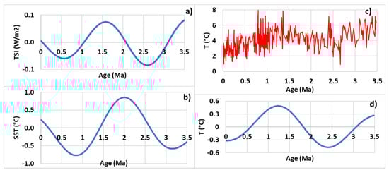Due to the limitation imposed by the observation period, the investigated bandwidth is 1769–3500 Ka, which does not enable the FT of the series. SST filtered into this band (Figure 6b) exhibits an oscillation whose period is estimated nearly 2.27 Ma (half-period between 0.877 and 2.01 Ma). This period corresponds to the subharmonic mode whose natural period is 36,864 × 64 = 2359 Ka. This time, it is probably a pure subharmonic because de-trended SST and TSI filtered into this band are out of phase (Figure 6a,b).