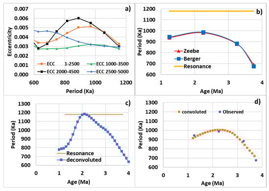 Variations in the period of eccentricity in the vicinity of 1000 Ka calculated from Berger and Loutre []—(a) Fourier transform of eccentricity variations over 2.5 Ma time intervals—(b) Periods vs. time observed at the maximums of the Fourier transforms in (a). The same values calculated from Zeebe and Lourens [] are also represented—(c) Deconvoluted curve of the period vs. time represented in (b–d) Comparison of the moving average over 2.5 Ma of the deconvoluted curve in (c) and the period vs. time in (b).