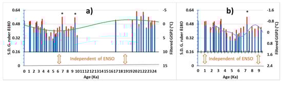 Variations in the standard deviation of individual G. ruber from the Holocene and Last Glacial Maximum. The high bar in red of snapshots represents the square root of the total variance of obtained from all the data while the low bar in blue excludes the heaviest and lightest value from each distribution. The bar on left indicates the 1958–2007 monthly standard deviation from instrumental SST and salinity. Values marked with an asterisk are recognized as doubtful by the author []—(a) Obtained from Greenland Ice Sheet Project 2 (GISP2) record filtered in the 18.4—36.9 Ka band, a proxy of long-term adjustment of geostrophic forces is drawn in green (the record is converted into the global temperature through the calibration )—(b) GISP2 record is filtered in the 2.3–4.6 Ka band.