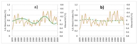 Thus, using in individual G. ruber as a proxy of the monthly Nino3.4 index, the part of the variance of the explanatory signal of ENSO in the band 1.5 to 7 years has to be estimated. The total variance of the Nino3.4 index from 1870 to 2020 [] is 0.785 °C2 and the variance in the band characteristic of ENSO is 0.360 °C2 so that the part of the total variance referring to ENSO is 45.8% (for information, the part of the variance in the band 0.5 to 1.5 years characteristic of the annual variability is 30.1%). By assuming that most of the long-term variations of the estimated standard deviation (considered as a function of time ) of G. ruber reflect the evolution of the ENSO activity, the invariant residual part is where is the mean of (Figure 8).