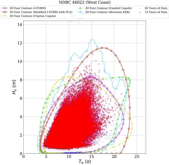 values, while the PCA and traditional I-FORM perform similarly, with less variability in the PCA contour results. These results are demonstrated in the examples of each contour method shown for NDBC 46022. For this site, the KDE method is the closest to the empirical data contour, as shown in