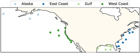 The application of this work is intended to focus on coastal sites. Because of this focus, the subset of 39 NDBC sites selected for analysis includes coastal regions only. While NDBC buoys with sufficient data are available in, e.g., the Great Lakes, these were not included in the present study.