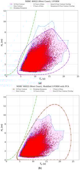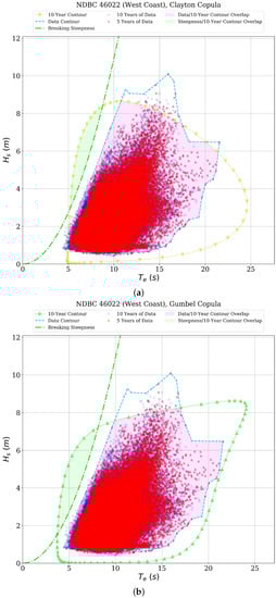 The comparisons provided above could impact design analysis workflows for offshore structures and the development of contour methods in several ways. First, the overall comparisons could be used to assist in the selection of contour methods for consideration in a design analysis. It may not be feasible for an analysis to consider any number of contour methods as a first step; the down-selection of methods for consideration could be a valuable first step in this process, particularly if more than the five methods presented in this paper were available for use. Second, the results presented above could be used to drive the development of additional contour methods or variations on the methods presented herein. For instance, the performance of the copula methods in terms of the  metric indicates that the expression of the joint distribution of  and  for these methods may miss some of the dependency of these parameters that encodes the physical constraint of the breaking steepness curve. Thus, the development of similar methods could focus on capturing this physical constraint as a part of the development of an expression of the joint distribution of the sea state parameters. Finally, the overall comparison framework presented could be utilized to assess newly proposed contour metrics against the methods that have previously been proposed. This would allow analysts to understand at a high level whether newer methods should be considered for deployment in design analysis workflows.