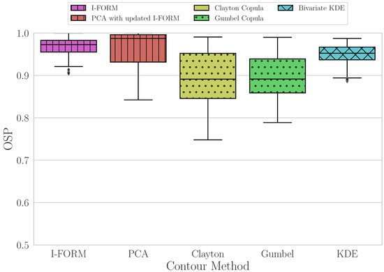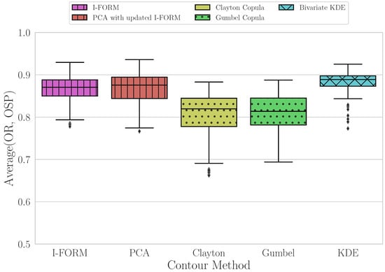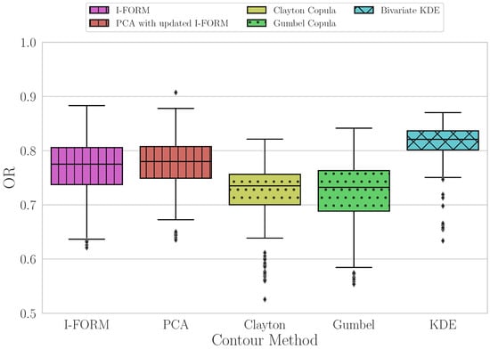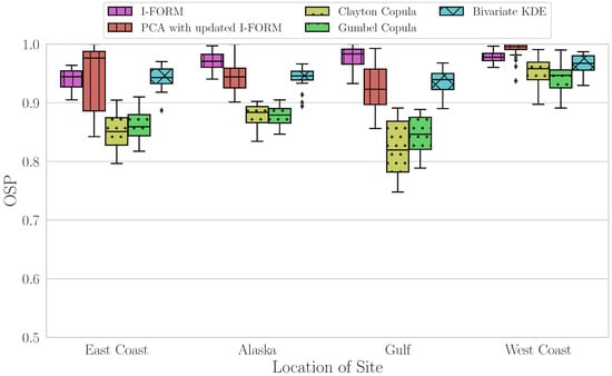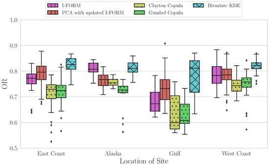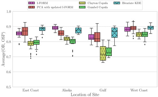 Figure 10 demonstrate that the copula methods have the lowest median value for this average metric, with slightly greater variability in the Clayton contour method results. The I-FORM and PCA methods perform similarly, with median values closer to 1 than the copula methods and with similar variability. Finally, the KDE method has the highest median value for the average metric and has the least variability across all sites, although there are some outlying sites with lower values.