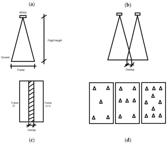 Sketch showing basic concepts of the remotely piloted aircraft system (RPAS) system: frame and flight height (a), overlap between two adjacent frames (b,c) and distribution of the different number of ground control points (GCPs) (d).