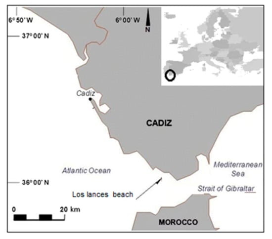 The chosen beach is Los Lances beach, in Tarifa (SW Spain). This area is considered as a bird special protection area due to its privileged situation that gives it a relevant role in air and marine migration processes (Figure 2).