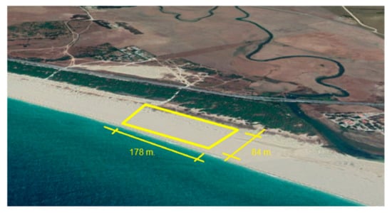 This space has a good state of conservation of ecosystems and a high-quality landscape. The beach is 3854 m long and covers an area of 280,000 m2. The study area, a 178 m by 84 m rectangle, is also shown in Figure 2.