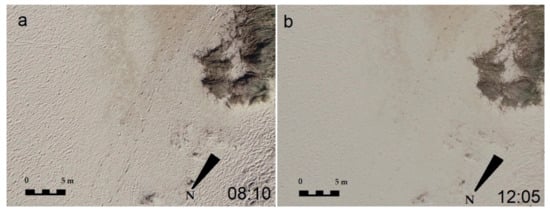 Frame detail: (a) early morning; (b) at noon. Frame details showing how shadows produce more homologous points in the early morning than at noon.