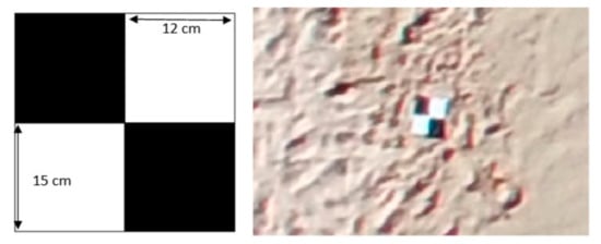 (a) Distribution on the beach of prefabricated landmarks to improve precision and calibration of the camera. Though some authors [] state that direct georeferencing with high camera location accuracy and GNSS receivers can limit the need for GCPs, these landmarks were used as GCPs and georeferenced. The GCPs were plastic, measuring 24 × 30 cm and about 5 mm high (Figure 4), and had a hollow that helped fix their position in the sand. The reverse was painted, creating an alternating white-and-black grid. The positions were chosen to try to get an optimal placement according to the literature (covering all four corners of the site, the highest and lowest elevations, and with sufficient cross-shore and alongshore coverage). Moreover, their location was maintained during the two flight campaigns so that the results were not affected by any movement.