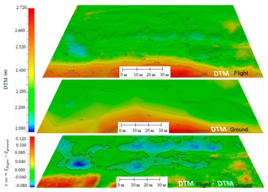 Figure 6 shows an example of this error (ε) calculated as the difference between the altitudes of the flight DTM and the topographic DTM (GPS on the ground)