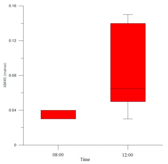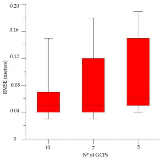 The first variable to consider is the number of GCPs. A box-and-whisker plot of their RMSE error is shown in Figure 7. Note that a boxplot is a standardized way of displaying the dataset based on a five-number summary: the minimum, the maximum, the sample median, and the first and third quartiles. You can see from the graph that there is a large distance between the lower (25%) and upper quartiles (75%) (IQR-Interquartile range), which are 0.10, 0.08, and 0.03 m for 5, 7, and 10 GCPs, respectively. Note that the whiskers (the two lines outside the box that extend to the highest and lowest observations) are similar in the three cases. The high value for the 10 GCP case is due to the existence of outliers for the noon survey. The variation of these results is far away from the results presented by other authors as James et al. [] whose RMSE had a negligible deviation because of the number of GCPs, obtaining 3.12, 3.57, and 3.59 cm for 5, 10, and 15 GCPs, respectively.