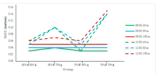 Starting with the noon flights (dashed lines), it can be seen that there is not too much difference between the results of 60 and 80 m flight heights. Regarding the forward overlap, there is no appreciable difference between both (70 and 85) percentages, i.e., forward overlap change from 85 to 70 did not influence final results. However, RMSE decreased enormously (from 0.15 to 0.05 m) when the side or transverse overlap changed from 70% to 85%.