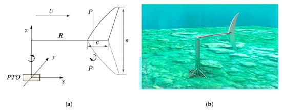 The hydrofoil is connected through the arm R to the vertical axis and the power-take-off system modelled by using a rotational spring of constant C and damper with coefficient B; see Figure 2. The dynamics governing the oscillatory motion of the considered device is governed by the balance of angular momentum about the vertical axis Oz,